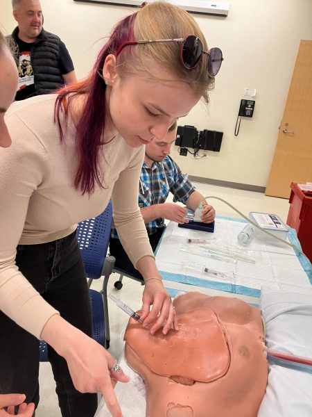 Across the room, also laser-focused on her task, is Viktoriia Totkalova. She’s using ultrasound guidance to insert a needle into an anatomically correct neck and torso. BMC ultrasound fellow Noelle Bates carefully guides her through the central line placement, a very skilled and potentially dangerous procedure.